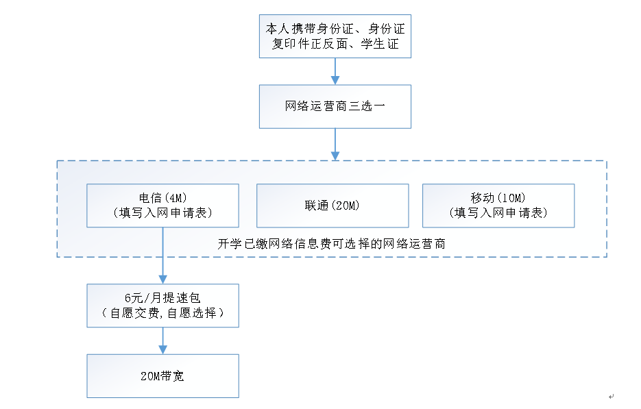 无需再缴费 (开学已缴300元网络信息费):电信带宽4Mbps,联通带宽20Mbps,移动带宽10 Mbps,三选一。