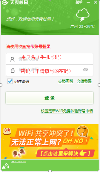 在上一步成功申请帐号后,打开已安装的软件“天翼校园客户端”,用自己申请时手机号码作为用户名,申请填写的密码登录即可。
