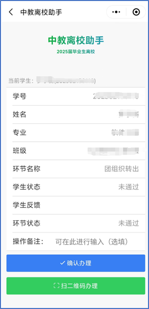 进入离校方案后点击“扫二维码办理”或者输入学生学号(扫码后显示学生的基本信息以及环节办理情况),点击下方“可操作的环节”如“证书领取”、“确定离校”等即可进入办理界面,并点击“确认办理”完成该环节的办理。