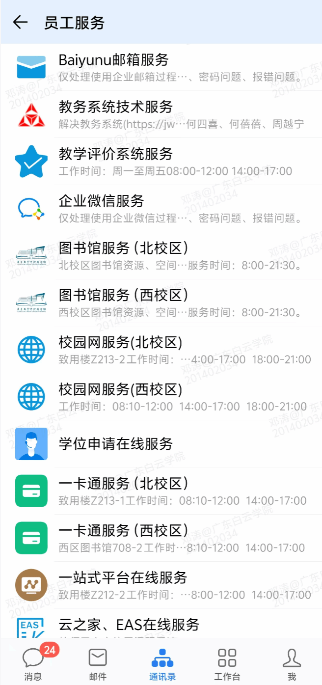 企业微信“员工服务”、“教务系统技术支持服务”窗口(24小时留言反馈)。
