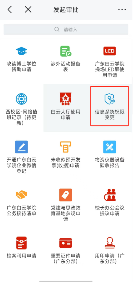 教职工用户登录云之家系统或者APP,依次点击“智能审批”-“发起审批”-“信息系统权限(变更)申请”,按照提示和要求填写表单信息(姓名、工号、业务系统、变更原因),提交后由部门负责人审批即可。