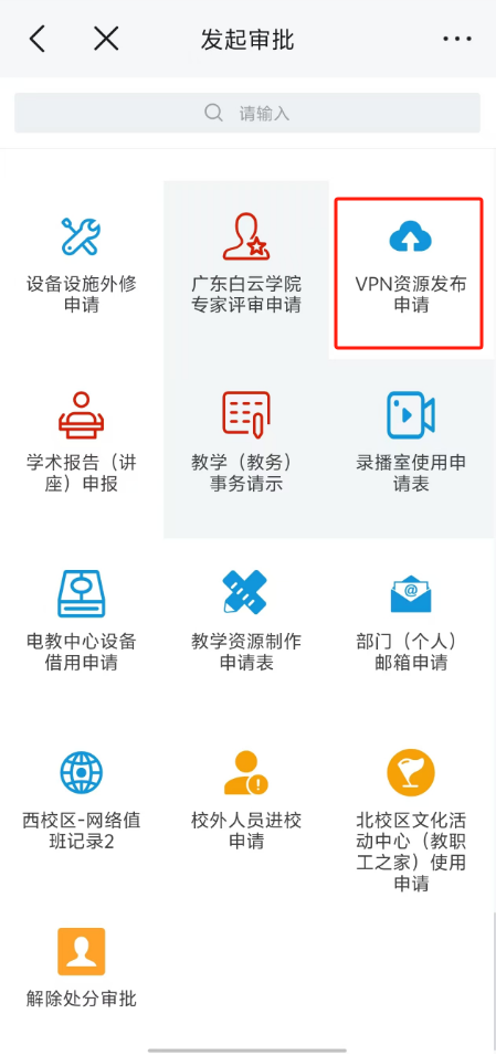 教职工用户登录云之家系统或者APP,依次点击“智能审批”-“发起审批”-“VPN资源发布”,按照提示和要求填写表单信息(系统名称、访问地址、服务对象、服务范围、用途等),并上传备案表签名版电子稿,提交即可办理。详细操作可参考《信息资源发布操作指南》。