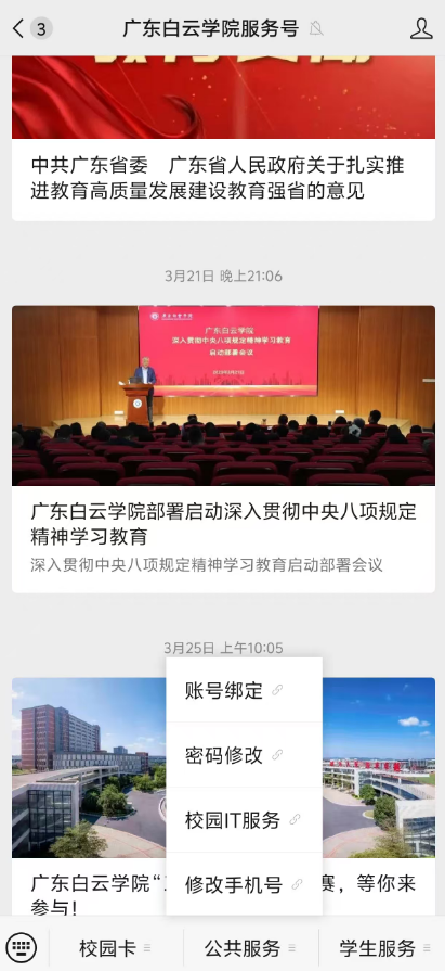 变更手机号则通过广东白云学院服务号(微信搜索服务号名“Byxyfwh”并关注),在公共服务栏目中点击“修改手机号”,通过原手机号认证后输入新手机号即可生效。
