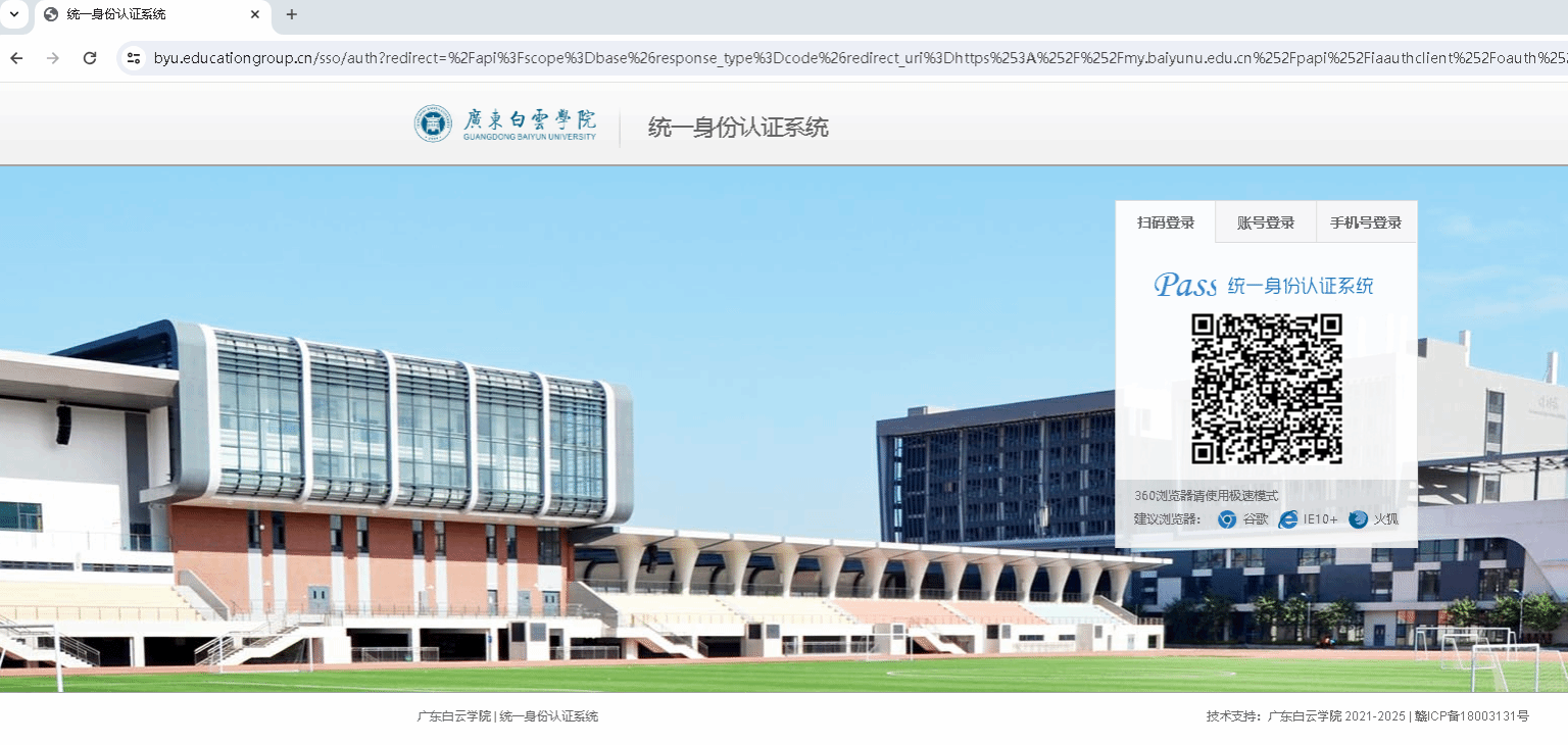我校核心系统已全部实现统一身份认证访问,登录其中的任一系统都可跳转至“统一身份认证”界面。如在电脑网页端访问我校信息门户(网址为https://my.baiyunu.edu.cn),自动跳转,分别支持手机号登录、账号登录、微信扫码登录三种认证方式。