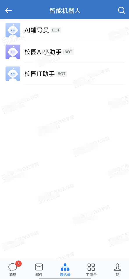 企业微信:进入通讯录点击“智能机器人”图标 。