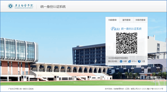 打开电脑浏览器,在地址栏输入网址webvpn.baiyunu.edu.cn后回车直接访问。也可以通过访问广东白云学院信息门户my.baiyunu.edu.cn,通过单点登录跳转。系统采用统一身份认证登录(选择“账号登录”并点击“密码找回”通过本人手机短信验证码认证后重置密码)。推荐使用微信扫码并授权登录,如下图: