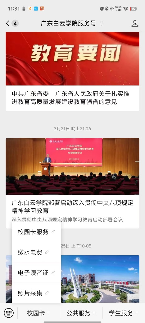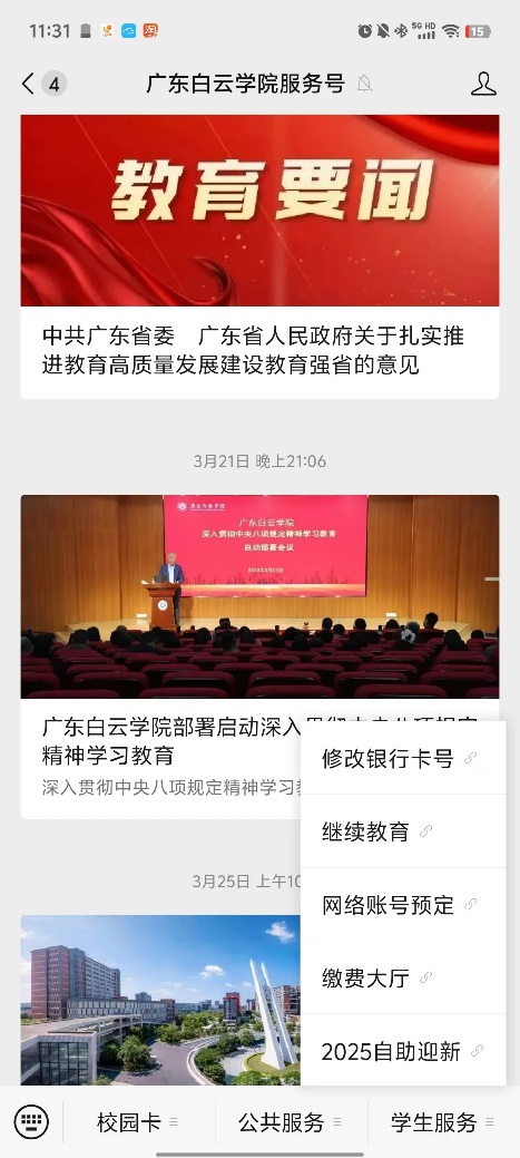 服务号底部设有 “校园卡”“公共服务”“学生服务” 三大菜单,覆盖校园卡管理、账号安全、缴费、迎新等高频场景,具体功能如下: