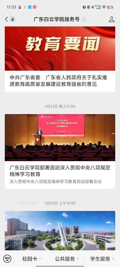 1. 关注“广东白云学院”微信服务号(微信搜索服务号名"byxyfwh");